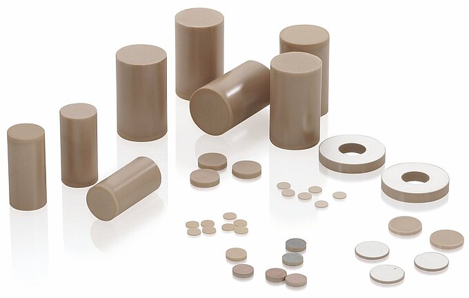 Piezo components are manufactured from different piezo ceramic materials, each precisely tuned to the application. Further modifications of the elements, such as very fine holes, structured ceramic surfaces, and even complex, three-dimensional contours can be produced individually. Shaping takes place either in the "green state", i.e., before sintering, or the sintered piezo ceramics are processed by precision diamond saws or cutters, known from semiconductor technology.