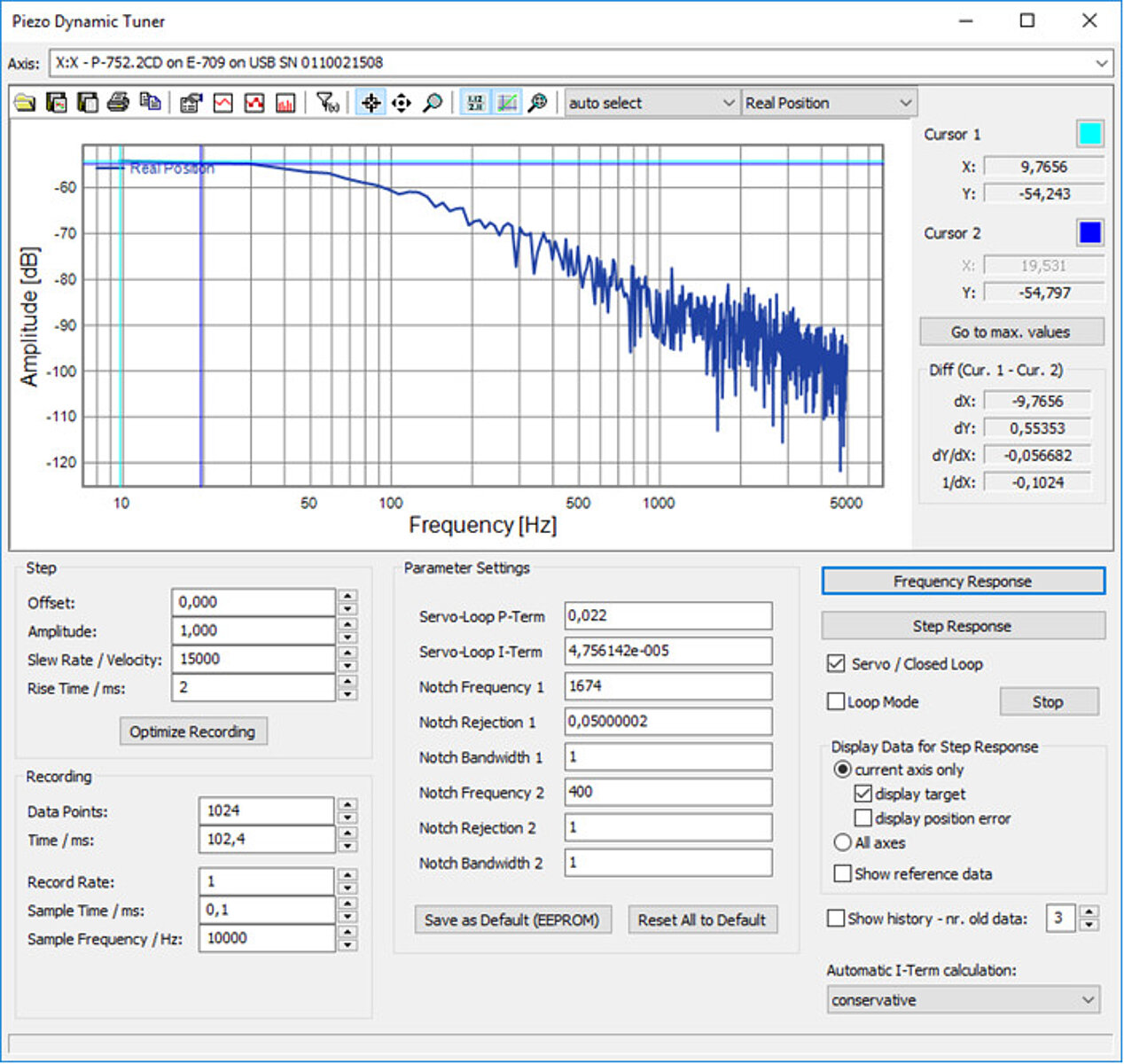 With the Piezo Dynamic Tuner the frequency and the step response of a system can be determined, and the settings for the servo parameters of the controller can be made. The user can set the control parameters and observe the respective system response. The type of system excitation and data recording can be configured to allow for an optimal characterization of the system. The Piezo Dynamic Tuner has various, powerful features for statistical analysis, determining the settling time, and for the import and export of the measured data.