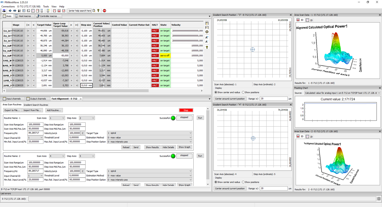 All positioning systems from PI can be controlled clearly and comfortably with PIMikroMove, independently of the drive principle, and the number and configuration of the axes. All connected controllers and axes are displayed in the same consistent graphical interface. Several axes can be controlled by different controllers and commanded with PIMikroMove in the same window. Using the Position Pad, the motion of two or more independent axes can be controlled using the mouse or joystick, even in vector moves.