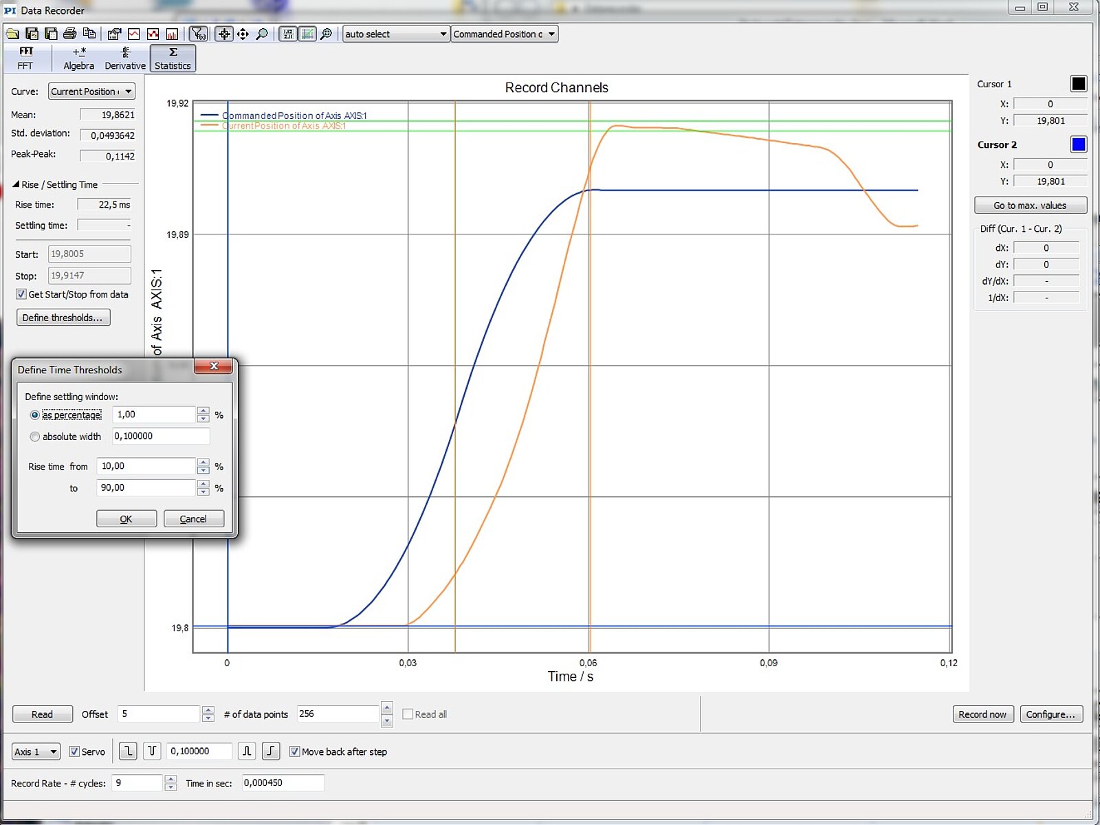 Stored, measured values are immediately displayed in the data recorder window in PIMikroMove. Thanks to highly developed functions a precise analysis and evaluation of the data can directly be carried out. In the integrated user dialog, an impulse can directly be commanded. The step response is recorded and represented graphically, therefore allowing for a fast analysis of the system behavior and for the tuning of the positioning behavior.