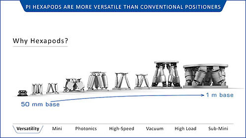 With three decades of Hexapod six-axis stage design and manufacturing experience, PI electro-mechanical hexapods and piezo hexapod positioners are the most advanced multi- axis precision positioning systems in the world, providing significantly higher precision than hydraulically driven systems. They are available in many sizes, and configurations for loads from 2 kg to more than 2000 kg, and most are self locking.