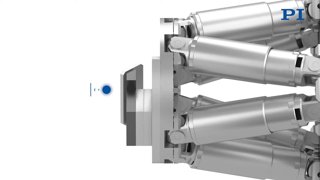 Hexapods, 6-axis positioning stages, are based on parallel kinematics, and often referred to as Stewart Platforms. A hexapod positioning system is based on a 6-axis actuator system (XYZ, Pitch, Roll, Yaw) arranged in parallel between a top and bottom platform. PI's parallel kinematics (PKM) multi-axis precision positioning systems have many advantages over conventional serial kinematics stages, including lower inertia, improved dynamics, smaller package size, and higher stiffness. The user-programmable pivot point – integral to all PI high-performance hexapod multi-axis motion controllers – provides additional benefits, especially in alignment applications of lenses, optics, and fiber optic components. Watch a short pivot-point demo video