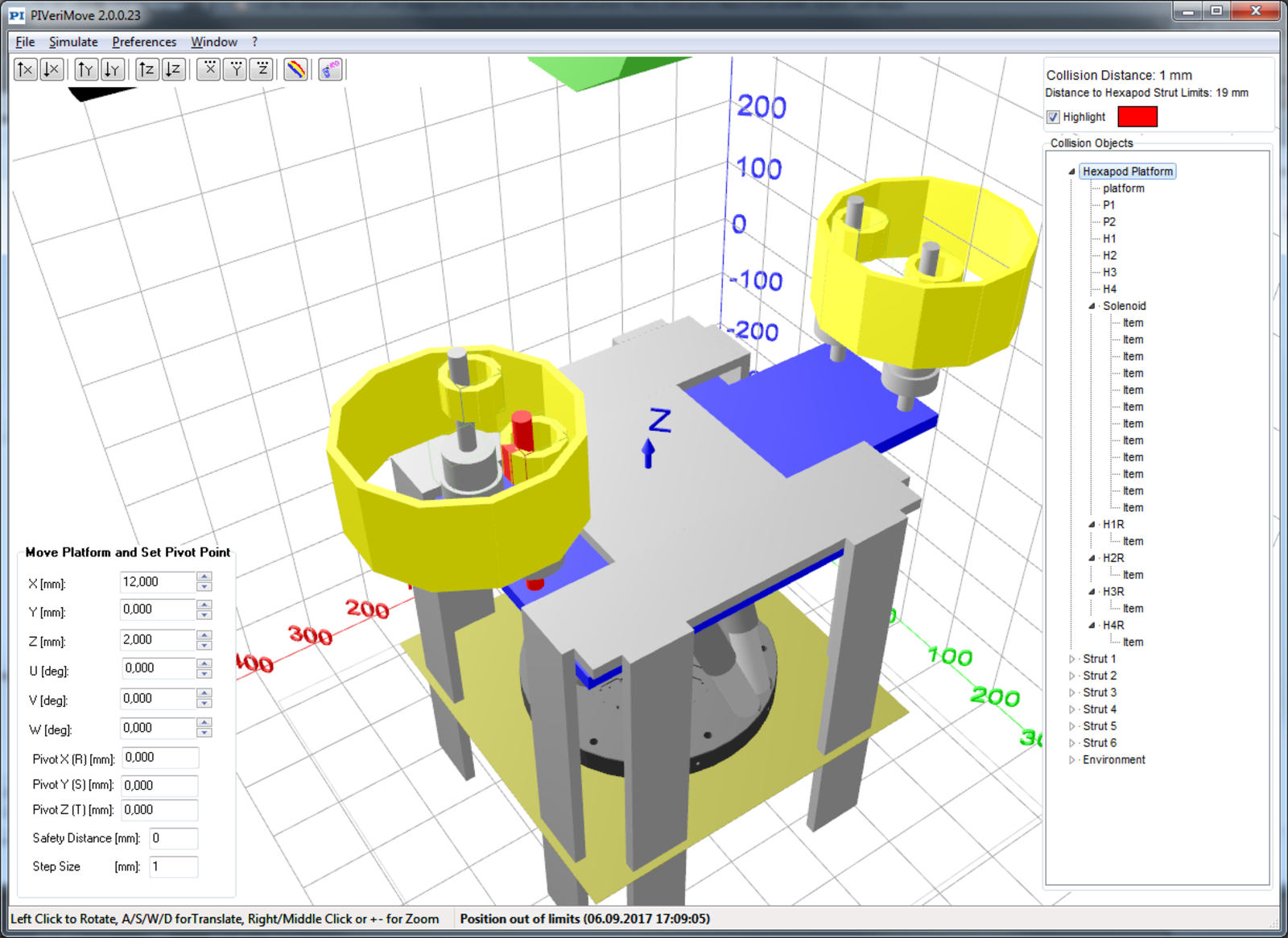 The PI hexapod simulation tool can comfortably simulate and graphically represent all of these influencing factors. It is therefore possible to recognize any mechanical problems before the application is set up.