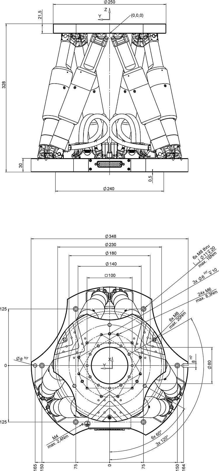 Precision hexapod; brushless DC gear motor; absolute encoder; 250 kg payload; 0.5 mm/s maximum velocity. Connecting cables are not included in the scope of delivery and must be ordered separately.