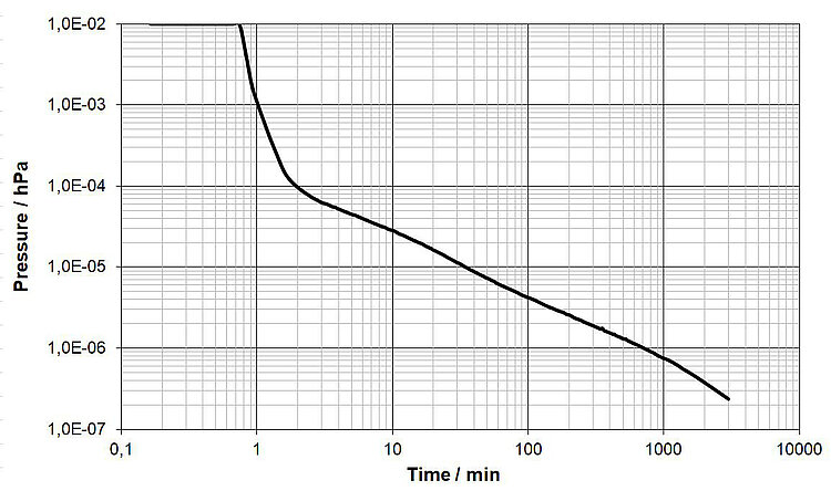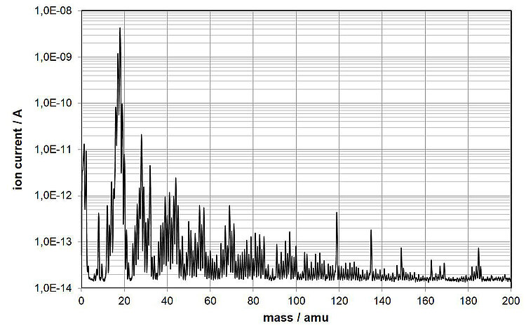 For products suitable for vacuum, residual gas analyses (RGA) can be performed in vacuum chambers with a volume of 10 l or 240 l. For this purpose, the pressure in the chamber is recorded during the entire test. The RGA (0 - 200 amu) is performed at the end of the test. The pressure curve of the individual phases (pumping down, bakeout, cooling down) as well as the RGA spectrum are provided as a result. Upon request, additional RGA spectra, e.g. after pumping down or after bakeout, can be recorded.