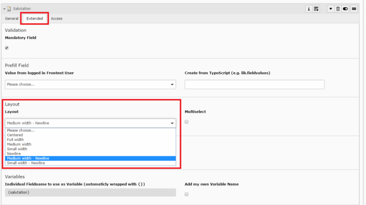Under the category "Extended", marked by the yellow circle, you will find further configurations for your form fields.